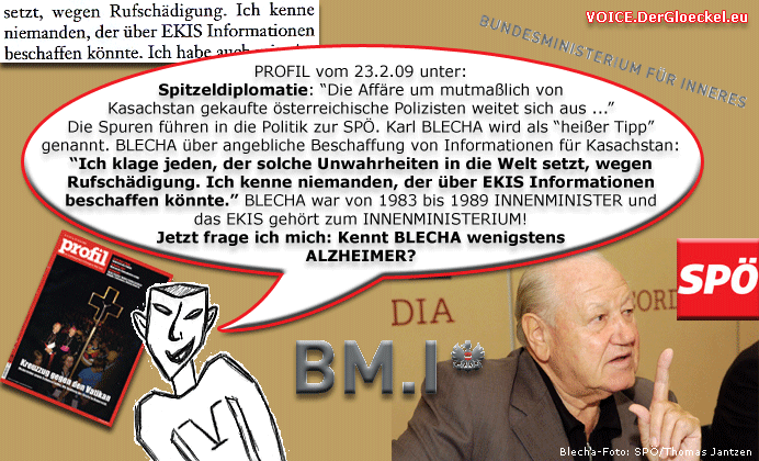PROFIL vom 23.2.09 unter: Spitzeldiplomatie: „Die Affäre um mutmaßlich von Kasachstan gekaufte österreichische Polizisten weitet sich aus …“ Die Spuren führen in die Politik zur SPÖ. Karl BLECHA wird als „heißer Tipp“ genannt. BLECHA über angebliche Beschaffung von Informationen für Kasachstan: „Ich klage jeden, der solche Unwahrheiten in die Welt setzt, wegen Rufschädigung. Ich kenne niemanden, der über EKIS Informationen beschaffen könnte.“
