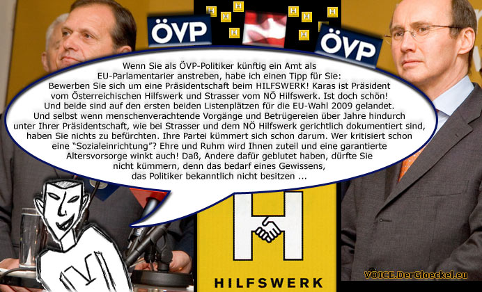 Wenn Sie als ÖVP-Politiker künftig ein Amt als EU-Parlamentarier anstreben, habe ich einen Tipp für Sie: Bewerben Sie sich um eine Präsidentschaft beim HILFSWERK! Karas ist Präsident vom Österreichischen Hilfswerk und Strasser vom NÖ Hilfswerk. Ist doch schön! Und beide sind auf den ersten beiden Listenplätzen für die EU-Wahl 2009 gelandet. Und selbst wenn menschenverachtende Vorgänge und Betrügereien über Jahre hindurch unter Ihrer Präsidentschaft, wie bei Strasser und dem NÖ Hilfswerk Link gerichtlich dokumentiert sind, haben Sie nichts zu befürchten. Ihre Partei kümmert sich schon darum. Wer kritisiert schon eine „Sozialeinrichtung“? Ehre und Ruhm wird Ihnen zuteil und eine garantierte Altersvorsorge winkt auch! Daß, Andere dafür geblutet haben, dürfte Sie nicht kümmern, denn das bedarf eines Gewissens, das Politiker bekanntlich nicht besitzen …