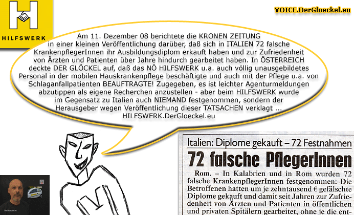 VOICE: Am 11. Dezember 08 berichtete die KRONEN ZEITUNG in einer kleinen Veröffentlichung darüber, daß sich in ITALIEN 72 falsche KrankenpflegerInnen ihr Ausbildungsdiplom erkauft haben und zur Zufriedenheit von Ärzten und Patienten über Jahre hindurch gearbeitet haben. In ÖSTERRIECH deckte DER GLÖCKEL auf, daß das NÖ HILFSWERK u.a. auch völlig unausgebildetes Personal in der mobilen Hauskrankenpflege beschäftigte und auch mit der Pflege u.a. von Schlaganfallpatienten BEAUFTRAGTE! Zugegeben, es ist leichter Agenturmeldungen abzutippen als eigene Recherchen anzustellen – aber beim HILFSWERK wurde im Gegensatz zu Italien auch NIEMAND festgenommen, sondern der Herausgeber wegen Veröffentlichung dieser TATSACHEN verklagtHILFSWERK.DerGloeckel.eu