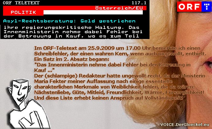 Im ORF-Teletext am 25.9.2009 um 17.00 Uhr bemerkte ich einen Schreibfehler, der einen wahren Kern, wenn auch ungewollt, enthielt. Ein Satz im 2. Absatz begann: „Das Innenministerin nehme dabei Fehler bei der Betreuung in Kauf …“