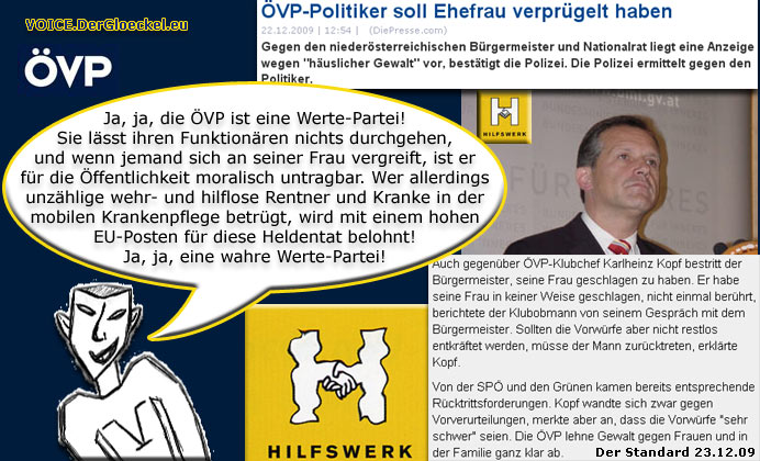 (VOICE) Ja, ja, die ÖVP ist eine Werte-Partei! Sie lässt ihren Funktionären nichts durchgehen, und wenn jemand sich an seiner Frau vergreift, ist er für die Öffentlichkeit moralisch untragbar. Wer allerdings unzählige wehr- und hilflose Rentner und Kranke in der mobilen Krankenpflege betrügt, wird mit einem hohen EU-Posten für diese Heldentat belohnt! Ja, ja, eine wahre Werte-Partei!