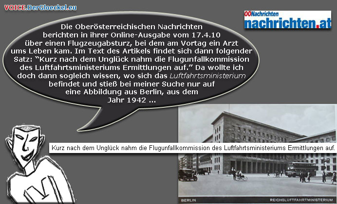 Die Oberösterreichischen Nachrichten berichten in Ihrer Online-Ausgabe vom 17.4.10 über einen Flugzeugabsturz, bei dem am Vortag ein Arzt ums Leben kam. Im Text des Artikels findet sich dann folgender Satz: „Kurz nach dem Unglück nahm die Flugunfallkommission des Luftfahrtsministeriums Ermittlungen auf.“ Da wollte ich doch dann sogleich wissen, wo sich das LUFTFAHRTSMINISTERIUM befindet und stieß bei meiner Suche nur auf eine Abbildung aus Berlin, aus dem Jahr 1942 …